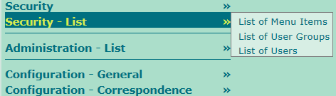 The "Security - List" section contains a series of lists related to menu items, user groups and users.