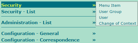 The "Security" Section contains screens that enable you to manage menu items, user groups and users.