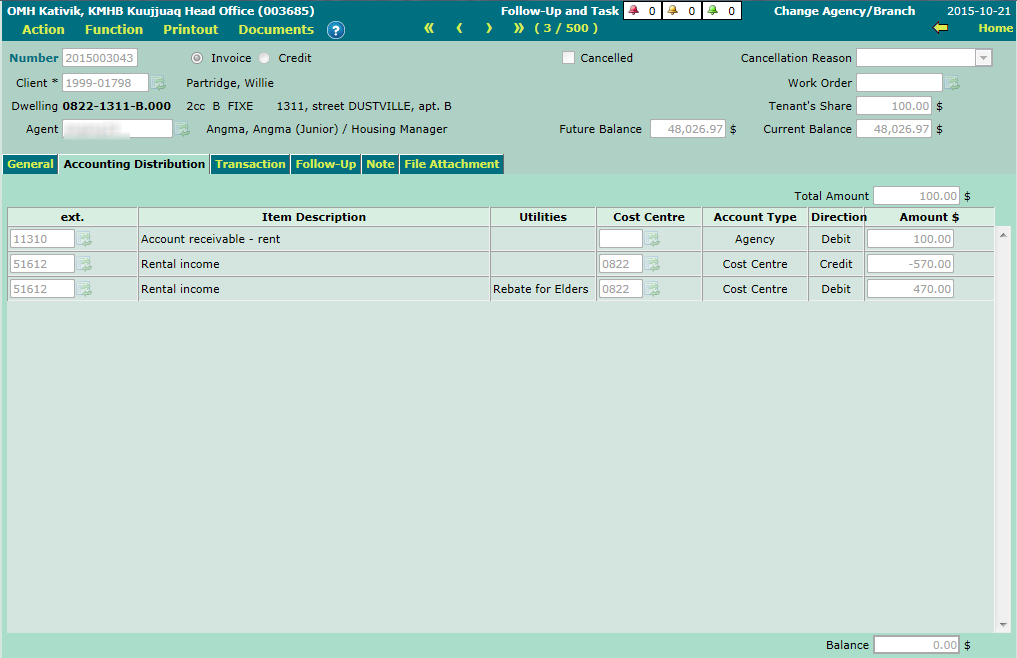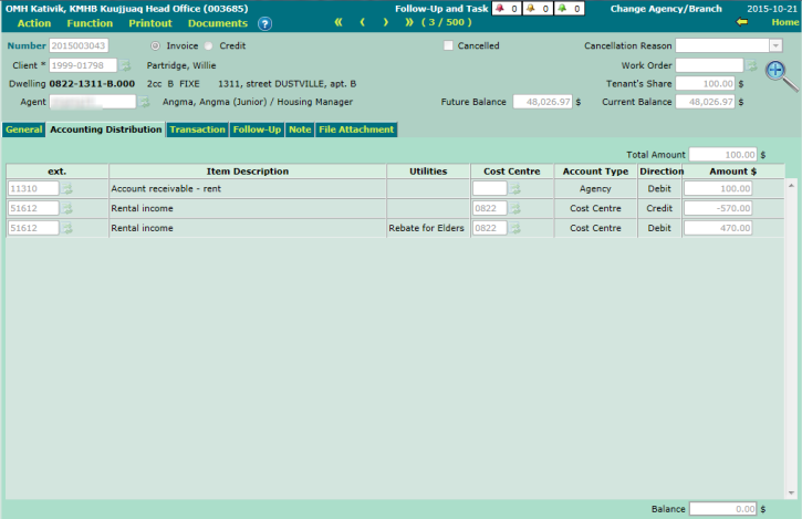 The "Accounting Distribution" tab enables you to adjust, if needed, accounting items, cost centres and amounts associated to the invoice's accounting distribution.