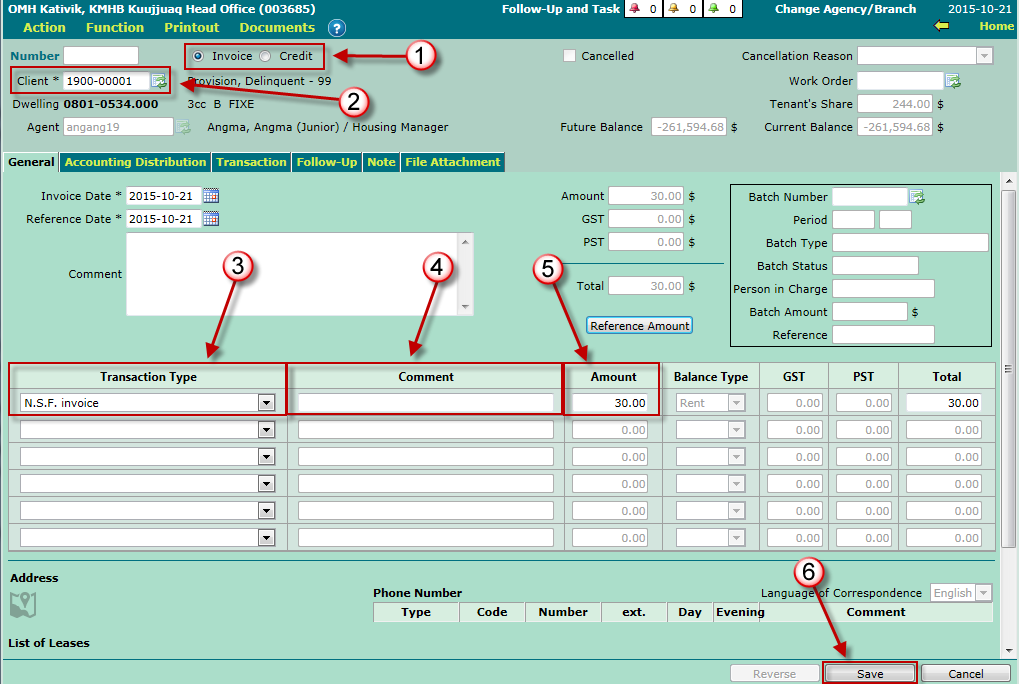 Select the transaction type (e.g. Rent invoice, N.S.F., etc.)