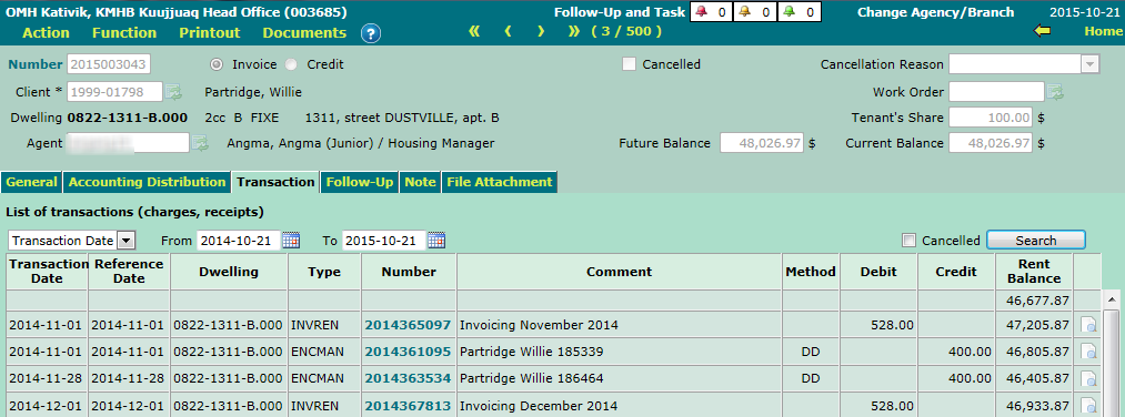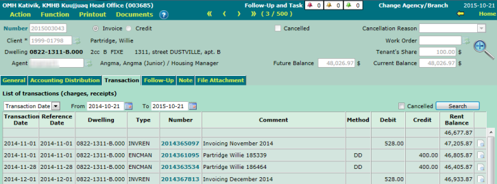 The "Transaction" tab lists all transactions (charges and receipts) for the client account associated to the current invoice.