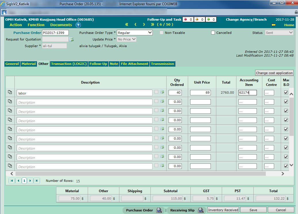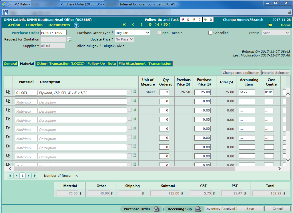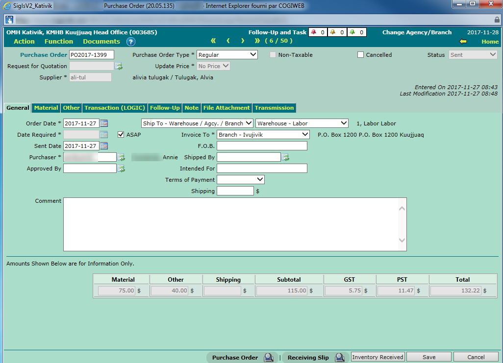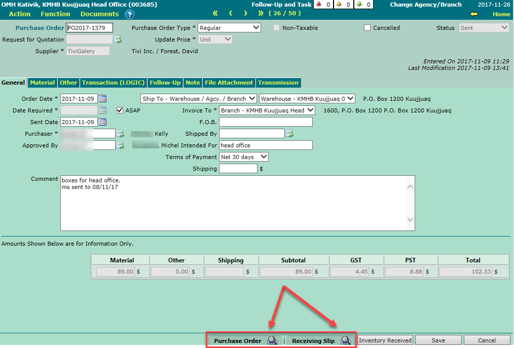 - The "Material, Other, Shipping, Subtotal, GST, PST, Total" information block cannot be modified. This block displays the order's grand total (not the total for the current page).
