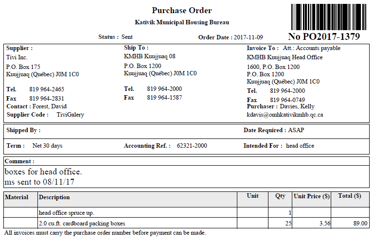 - The "Comment" field is optional. This field enables you to enter general information regarding the purchase order.