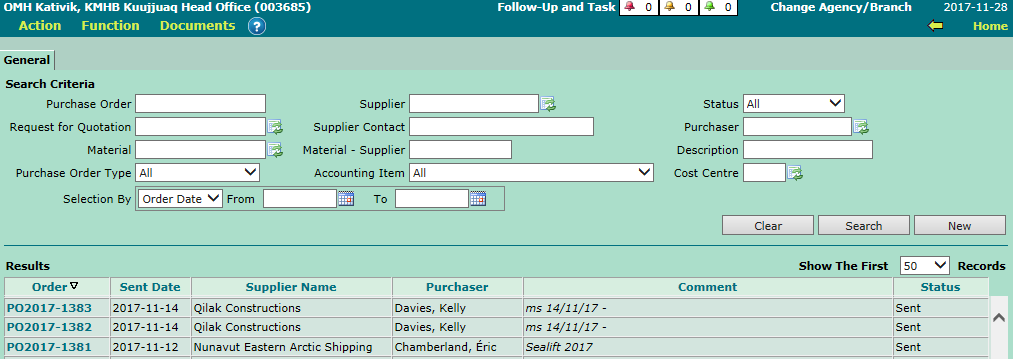 You may search for purchase orders using several criteria. Searching by status is great for viewing the progress of a purchase order.