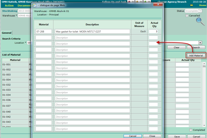 To add one or several missing materials in the list, click the "Add Material" button. A popup window will help you enter the material's code, description and actual quantity for one or several materials. Click the "Close" button to save the new materials.