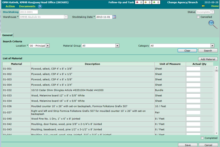 The "Stocktaking" screen enables you to carry out stocktaking of materials in a specific warehouse.