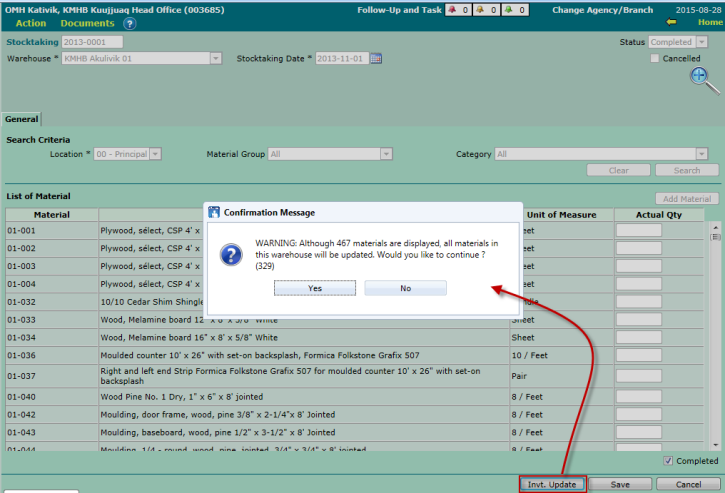 - When the stocktaking is at the "Completed" status, the "Invt. Update" button appears at the bottom of the screen. This button enables you to update the inventory in accordance with the quantities entered in the "List of Material". Please note that this button only appears for users with the required inventory management access rights.